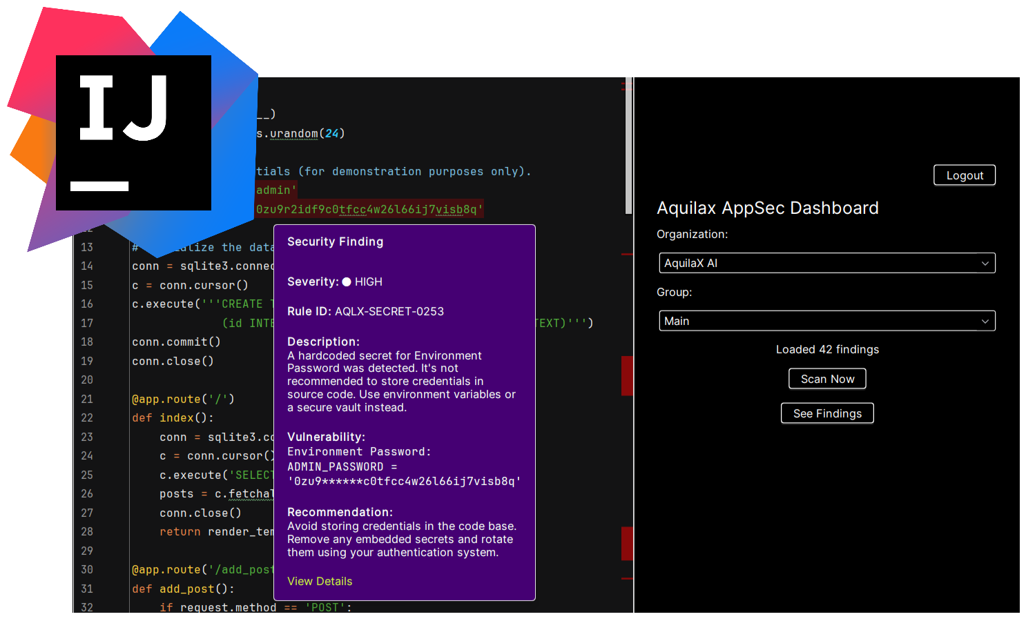 Available via JetBrains Marketplace (search “AquilaX AppSec”) — install and restart IDE.