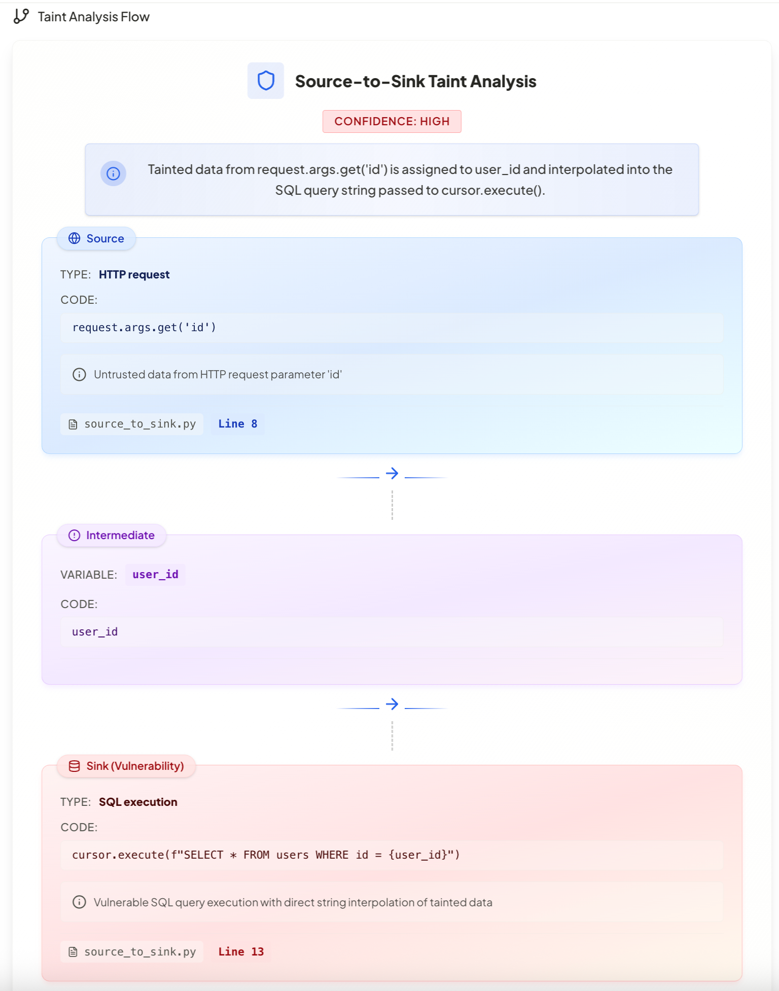 This feature allows users to trace data flow from the initial point of injection (source) all the way to the vulnerable function (sink). By following this path, developers can visualize the exact journey of potentially harmful data, making it easier to pinpoint where the vulnerability originates—and more importantly, where it can be fixed.