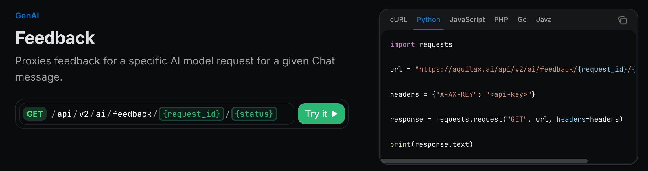 API Documentation: developers.aquilax.ai/api-reference/genai/feedback